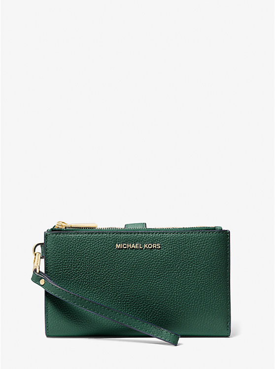 Done in a rich pebbled leather for timeless status, this sleek wallet has two zip sides that unfold to reveal a center with pockets for all the essentials, from credit cards to your smartphone. A wristlet strap perfects its versatility factor, so it can be carried alone or in a tote.