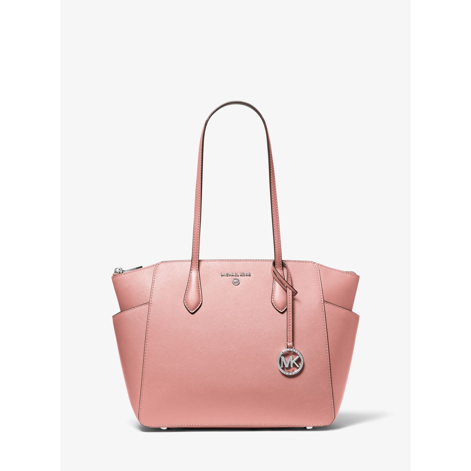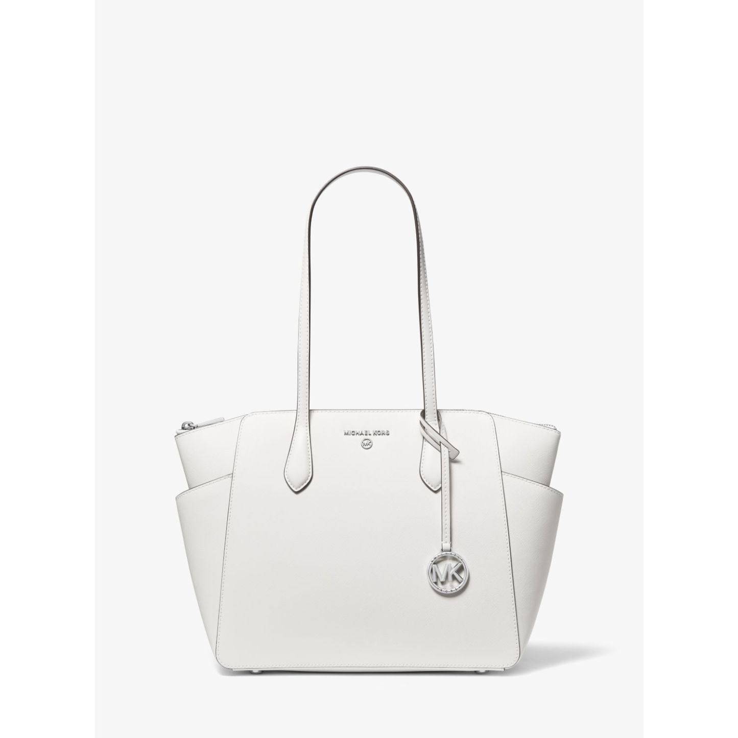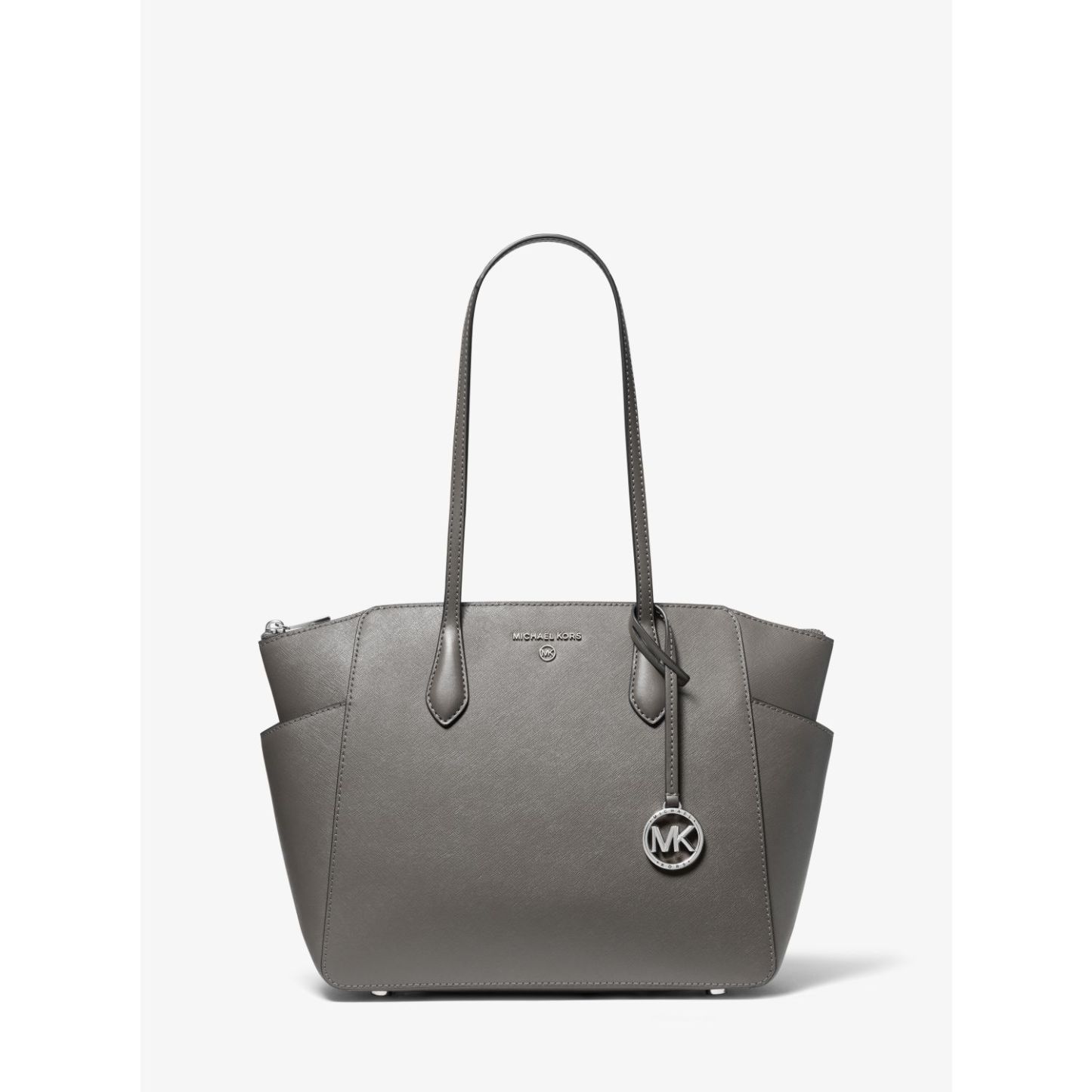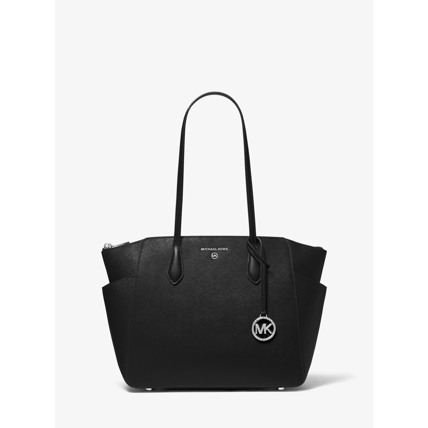 DESIGNOur Marilyn carryall is the ultimate everyday tote bag. The brand’s iconic “MK” hardware leaves a memorable mark, while the structured Saffiano leather silhouette unzips to reveal a spacious interior with dedicated pockets for your daily essentials. We love how the slender straps easily slip over your shoulder to ensure on-the-go ease.