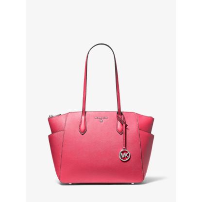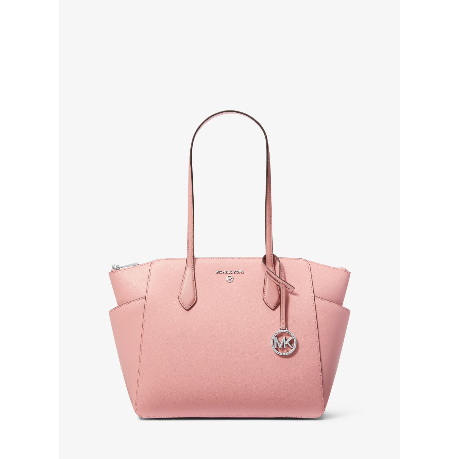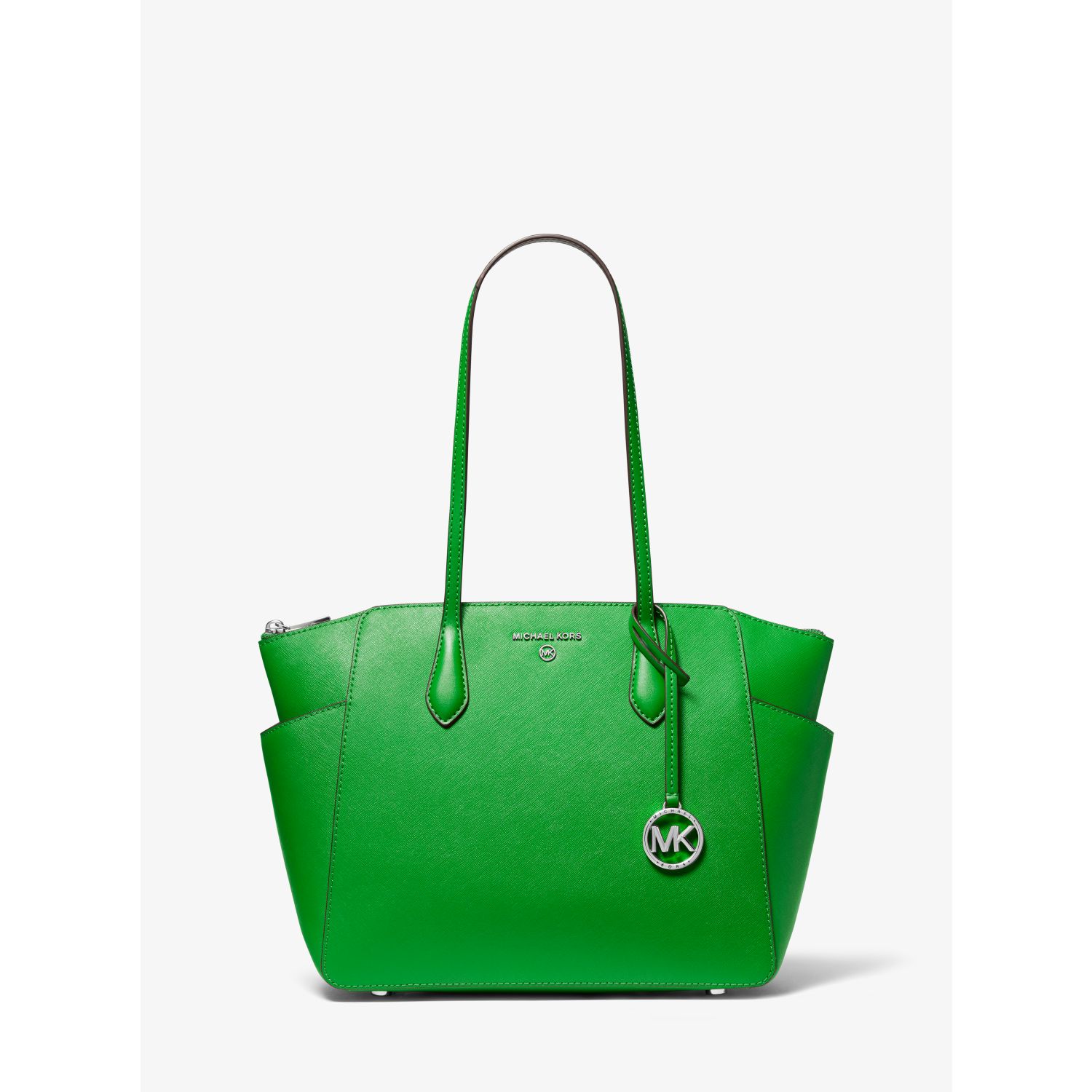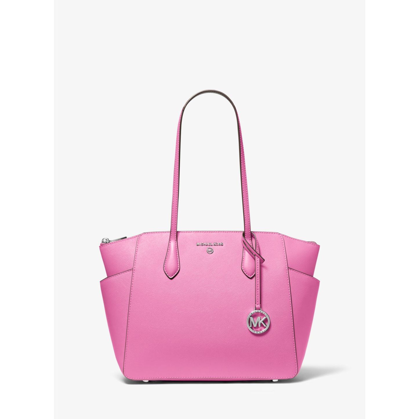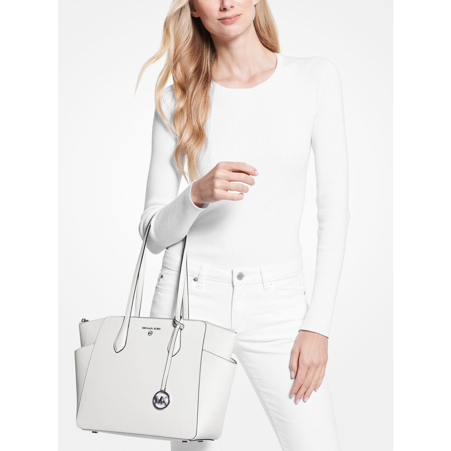 DESIGNOur Marilyn carryall is the ultimate everyday tote bag. The brand’s iconic “MK” hardware leaves a memorable mark, while the structured Saffiano leather silhouette unzips to reveal a spacious interior with dedicated pockets for your daily essentials. We love how the slender straps easily slip over your shoulder to ensure on-the-go ease.
