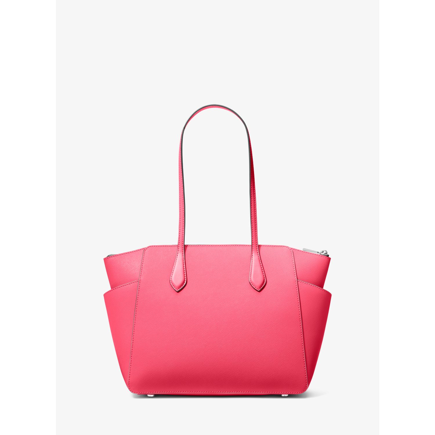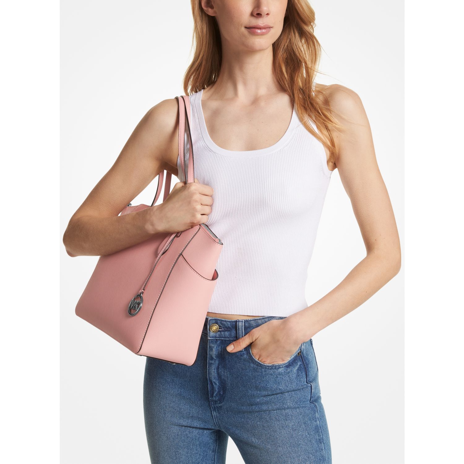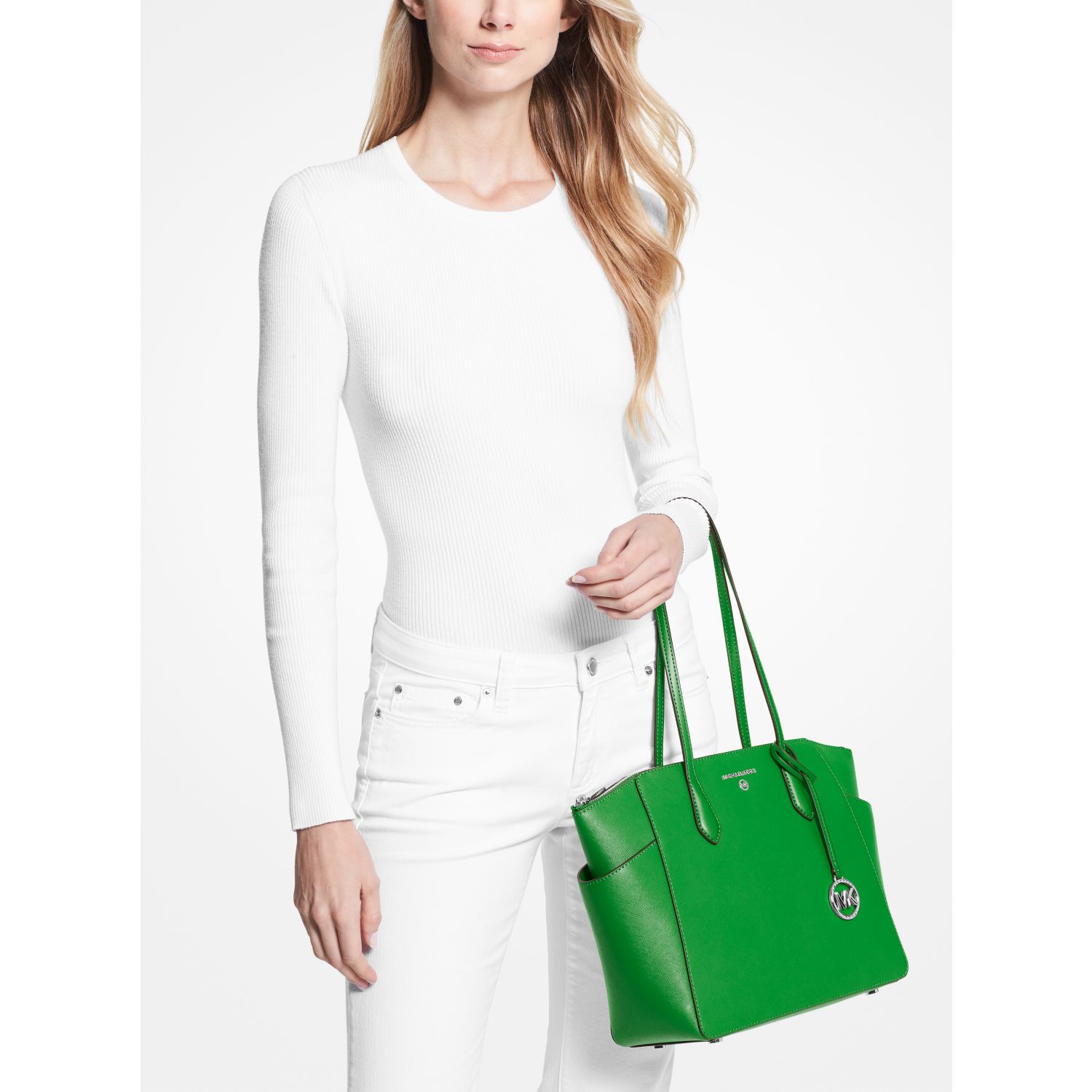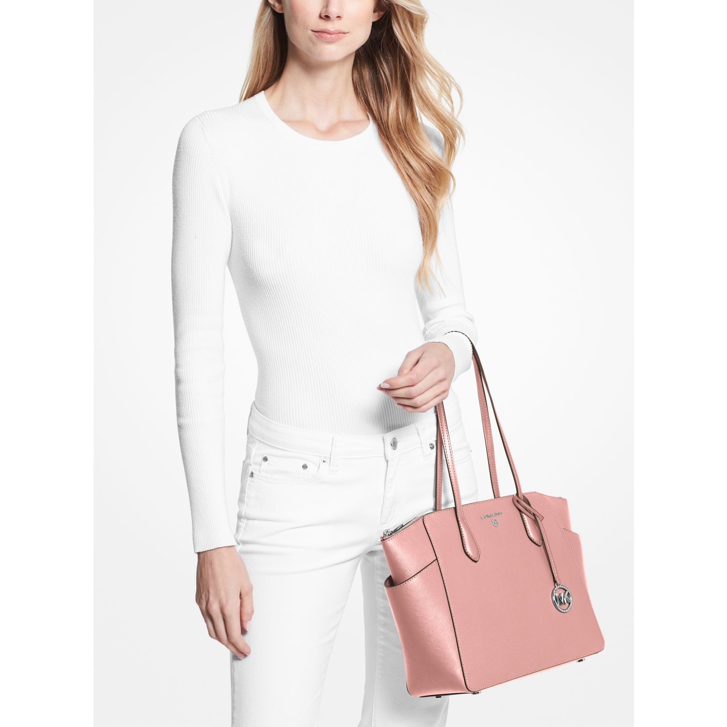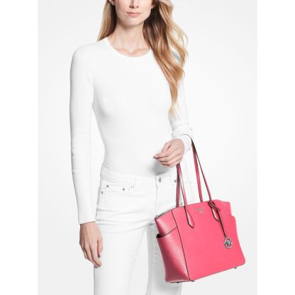 DESIGNOur Marilyn carryall is the ultimate everyday tote bag. The brand’s iconic “MK” hardware leaves a memorable mark, while the structured Saffiano leather silhouette unzips to reveal a spacious interior with dedicated pockets for your daily essentials. We love how the slender straps easily slip over your shoulder to ensure on-the-go ease.